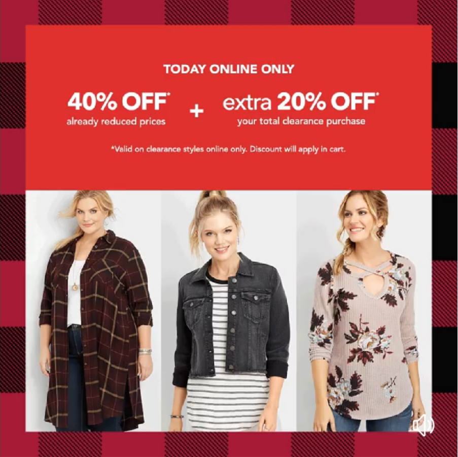 Today only at Maurices, take 40% off of already reduced prices + an extra 20% off you total clearance purchase!