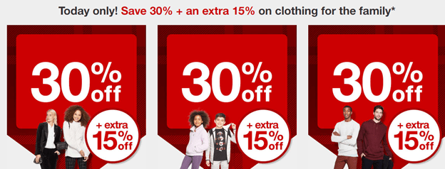 At Target, Save 30% plus an additional 15% on clothing, shoes, and accessories for the whole family online only – ends today 12/2!